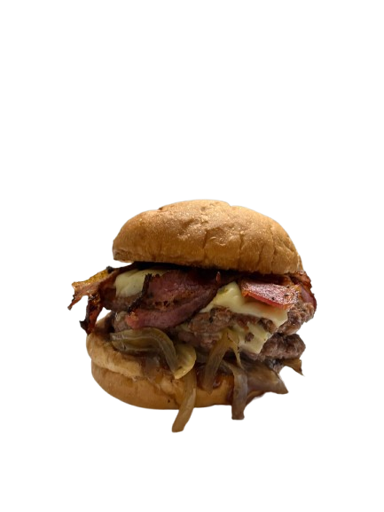 Medallón simple o doble de 100gr, cheddar smoked, cebolla caramelizada, panceta y salsa BBQ.